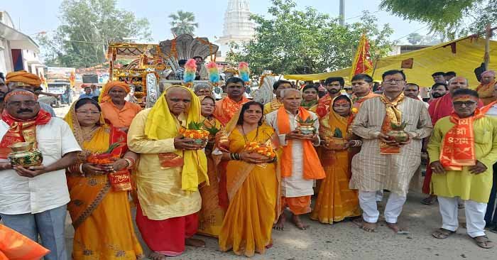 यात्रा में महिलाएं सिर पर कलश धारण किए चल रही थीं, और भजन-कीर्तन करते हुए श्रद्धालु आगे बढ़ रहे थे। नगर भ्रमण के बाद श्रद्धालु दशरथ ब्रह्मस्थान स्थित यज्ञ मंडप पहुंचे, जहां वैदिक मंत्रोच्चार के बीच विधिवत कलश स्थापना की गई।