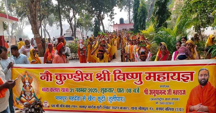 ज्ञात हो कि टी.एन. मिश्रा एवं दूधनाथ यादव पूर्व से ही आध्यात्मिक कार्यक्रमों में बढ़–चढ़कर हिस्सा लेने के लिए जाने जाते हैं। आज भी उनका उत्साह और श्रद्धा देखते ही बन रहा था। महदेवा कुटी से यात्रा आगे बढ़ते हुए कलश यात्रा खैरा सरयू तट पहुंची, जहां कन्याओं ने अपने कलश में पवित्र सरयू जल भरा। इसके उपरांत गाजे–बाजे के साथ कलश यात्रा यज्ञ स्थल की ओर रवाना हुई।