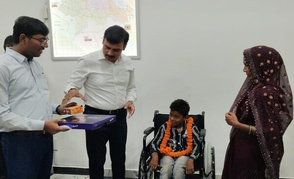 जिलाधिकारी मंगला प्रसाद सिंह ने बुधवार को अपने कार्यालय में जनसुनवाई के दौरान दिव्यांग नीलेश राजभर पुत्र नरेंद्र राजभर ग्राम पिलुई, ब्लॉक मनियर को व्हील चेयर प्रदान की